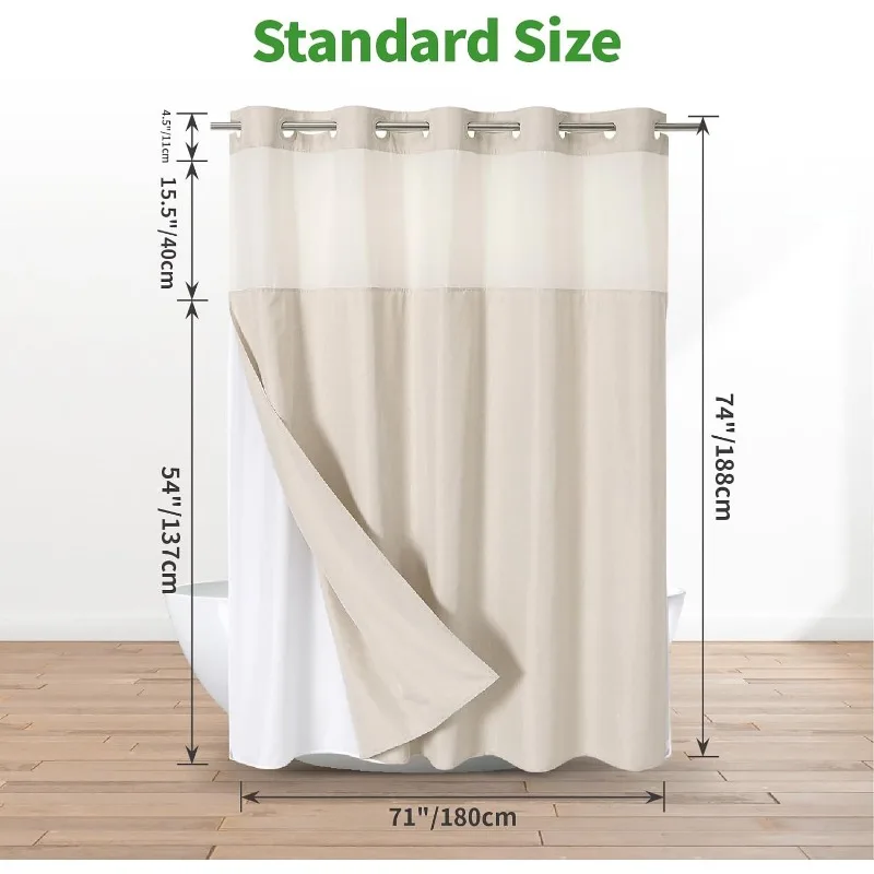 【Standard Size】: The shower curtain is 71″W x 74″L (same size as the 71″W x 72″L hook-on shower curtain), and the snap-on liner is 70″W x 54″L. Fits most standard-sized bathrooms